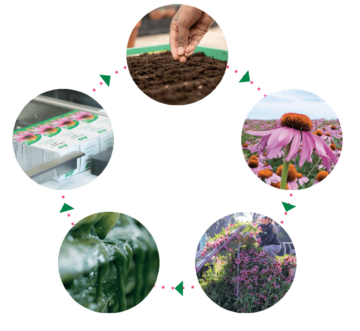 Pour Echinaforce®, plus de 200 étapes de qualité – de la graine au flacon – assurent des ingrédients actifs stables et concentrés de manière optimale.