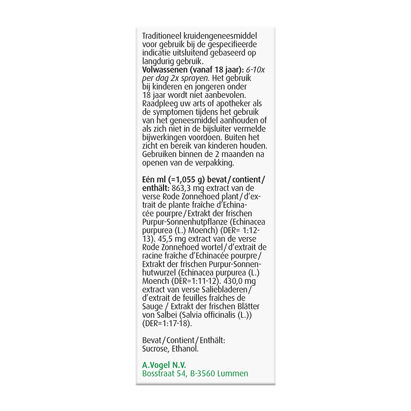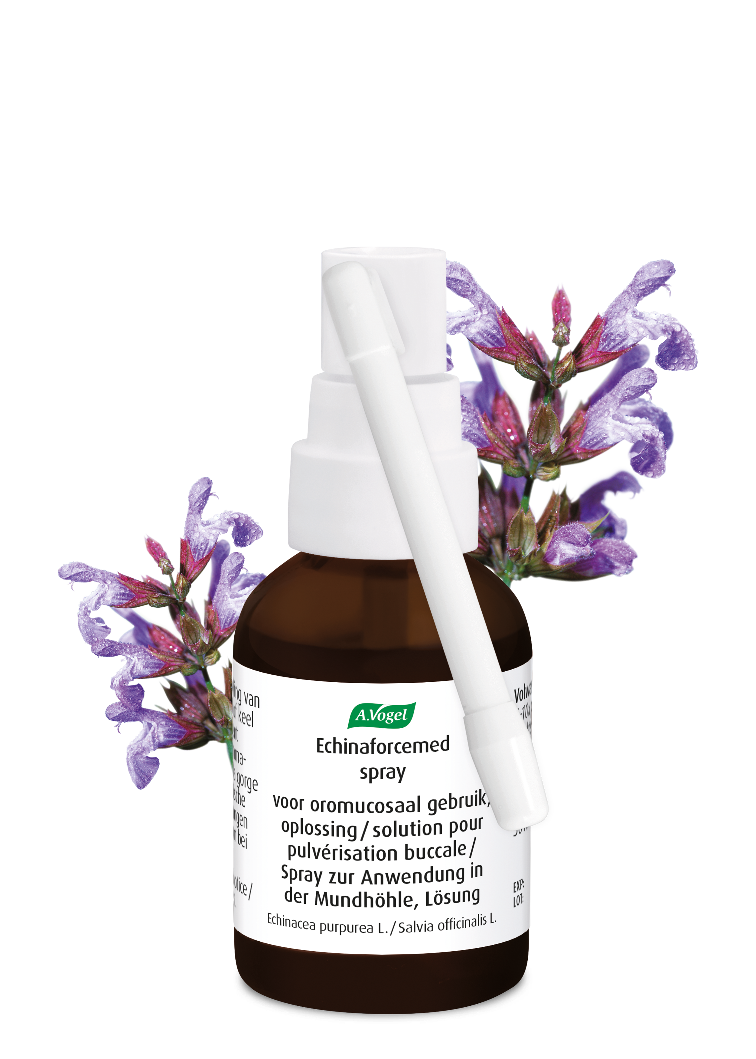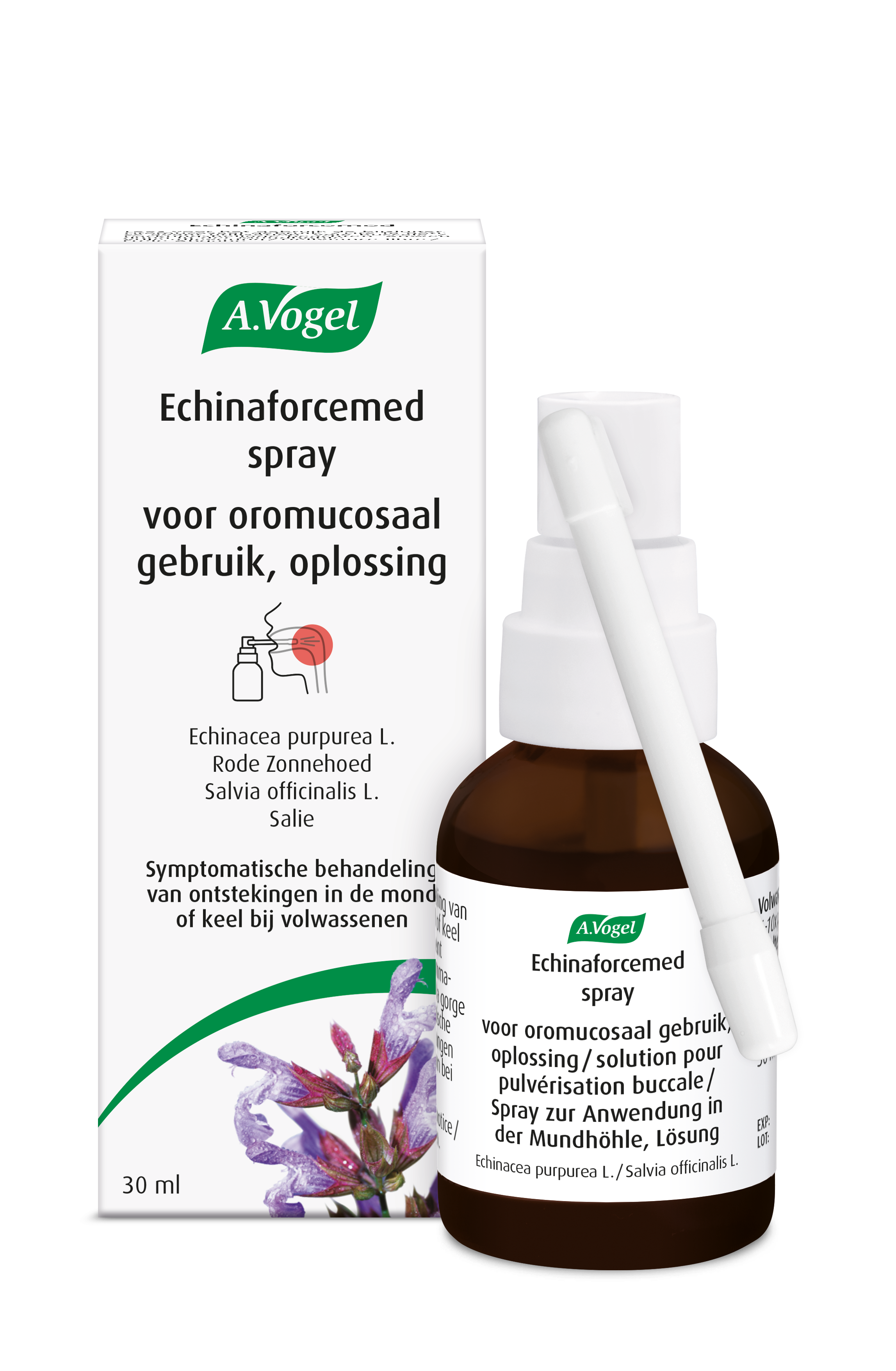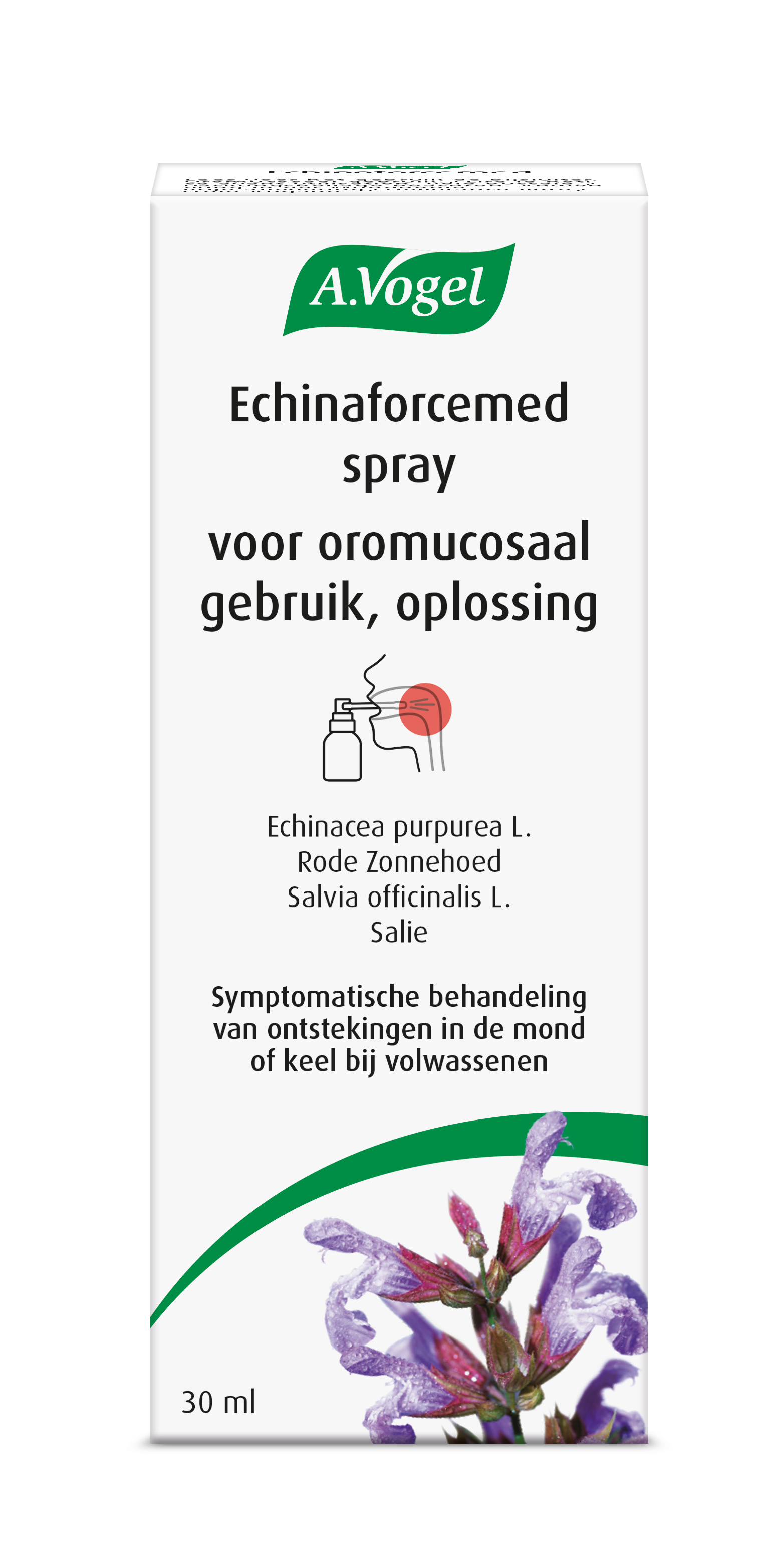 Echinaforcemed spray voor oromucosaal gebruik, oplossing is een traditioneel kruidengeneesmiddel gebruikt voor de symptomatische behandeling van onstekingen in de mond of keel bij volwassenen, uitsluitend op basis van langdurig gebruik. Gebruik enkel voor volwassenen. Geen gebruik langer dan 1 week zonder geneeskundig advies. Lees aandachtig de bijsluiter. Vraag raad aan uw apotheker. Gebruik dit geneesmiddel niet indien u allergisch bent voor pinda’s of soja. A.Vogel N.V.